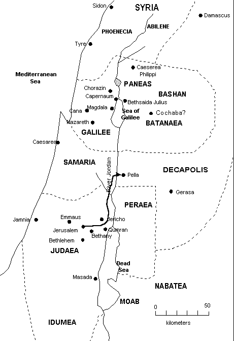 | a. | Gerd Ludemann, who is rather skeptical of the Pella tradition, suggested another flight tradition, one in which the relatives of Jesus fled from Nazareth to Cochaba, in Batanaea. (See map above) The evidence is one cited by Eusebius in History of the Church 1:7:14 which, on provide an excerpt from the writings of Julius Africanus, a second century CE Christian writer (c.160-c240). Africanus in that excerpt tied the relatives of Jesus (the desposynoi) to Cochaba after Nazareth. This led Ludemann to conclude that there is some tradition to tied in the fleeing of Jesus' relatives to Cochaba to escape the effects of the war. [1]