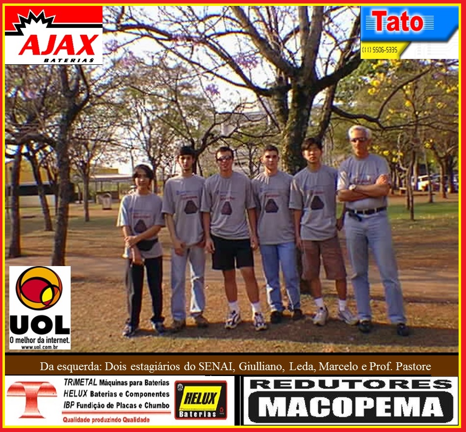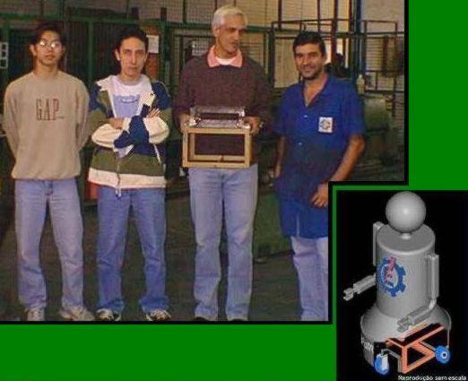 Colaboradores Marcelo Shiwaku, Jorge Gotchea e Chefe da Oficina Efei Sr. HelioDevido a escassez de recursos, estamos aceitando doações de peças, componentes, enfim patrocinadores, para que possamos construir o referido robô, para maiores esclarecimentos - Ex e-mail: [email protected] (desativado) Novo e-mail: [email protected] e, atual E-mail 2016 . Este robô não foi construído, devido que em seguida, abril de 2001 fui convidado pelo Prof. Dr. José Arnaldo Montevechi ( CNPq Lattes ), do departamento de Engenharia de Produção Efei ( Professores Unifei ), a ser o professor mais direcionado, para levar a Efei num evento em Campinas, por ele ter participado de uma reunião com professores universitários na Unicamp (Efei, Ita, Usp, Poli e Unicamp), assim este robô foi esquecido e, suas peças foram aproveitas para o segundo robô (o redutor Macopema que aparece na foto, foi usado no veiculo teleguiado Scorpion), que viria a ser chamado de "Robô Scorpion", quando estes alunos na foto do primeiro robô autônomo, eram os que eu tinha nas mãos e, para existir uma equipe para tal evento, vim a fazer triagem de pelo menos 80 alunos dos diversos cursos de graduação e de pós graduação Efei, porém nenhum deles se interessavam, queriam bolsas de estudo, mas este certame era para voluntários, que por fim consegui com muita garra, persistência de minha parte, obter a colaboração de sete voluntários, que os orientei em salas de aulas, como deveriam participar, como deveriam formar uma equipe, fomos no encalço de patrocinadores, mas nada efetivo, tivemos que arcar com todas as despesas, de viagens para Campinas, em que o pai de um dos alunos, dentre eles, do Giuliano Straçallano, o pai dele cedeu uma casa de aluguel, em Campinas, aonde nós pudemos pernoitar, no chão, é claro, por que não era um hotel.