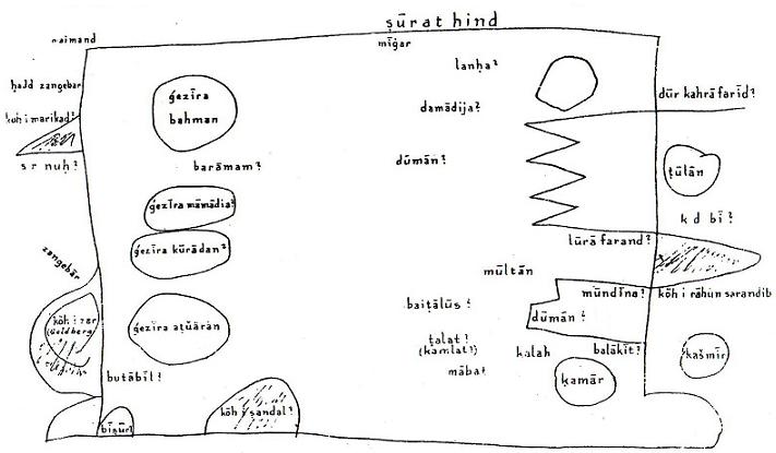 | The above map comes out of Gotha Codex Persicus 35; from a 1388 AD manuscript from Paris the following infrmation is extracted. Taken from the website of the French National Library The full title of this book is Kitab Aja ib al-Makhluqat wa Ghara ib [al-]Maujudat. The author's name does not appear in any manuscript and evidence of authorship remains problematic. However, Hajji Khalifa attributes the work to Mohammed bin Mahmud bin Ahmad al-Tusi al-Salmani. The text is divided into ten main sections. They are: 1. Angels and spiritual beings; the poles; the marvels of the sun, moon, planets and stars. 2. Fire and fire-worshippers; meteorology. 3. The earth, its features,divisions and climates. 4. Cities, mosques and temples; natural disasters. 5. Trees and plants. 6. Statues, talismans, marvels of tombs of prophets and royal treasures. 7. Mankind, soul and physical features. Woman.Peoples and tribes. Prophets, wizards and pretenders. Alchemy, medicine, qualities of foods. Wonderful cures.Fate, dreams, death. The faithlessness of the world.The resurrection. 8. Jinns, devils and ogres. 9. Birds. Animals, sea creatures, appendix on 72 demons, all illustrated, and the afflictions they bring to mankind. The demons were said to have been chained up by Solomon, but effected their escape on his death and returned to their evil ways. Possibly based on a separate work of demonology. As far as I know the works remains untranslated and unpublished. It does however contain material on East Africa. The few things I was able to find are: fol;243v lion fol 234 giraffe giving birth fol 197 People of black Africa with dotted skin fol 196v People of Zandj fol 58 Worldmap fol 46v Kay Husraw observing the hybrides in the sea of Zanzibar |