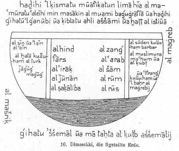 To next page Al-Dimashqi (1325) Nukhabat ad-dahr (Wonders of the world) from Damascus ----------------------------------------------------- Taken from : the translation by M.A.F. Mehren 1874 / map out of the Miller atlas Also called Dimichqi The equator starts at the fortune and eternal islands in the western sea or green sea and goes east, to the north of the mountains of the moon (djabel al-Kamar) and the region called Sofala, of the land of the Zendjs and the isles in that area, passing the island Dybadjat between the Isle Sarandyb and the isle Seryra.... On the other side of the equator there were in the days of Ptolemy eight towns: Al-Komar, Aghna (Ceylon), Lokmerana, Dahna, Lenlemeh (west africa), Daghuta(east africa), Sefakis, Kegha.... Part of the big isle of Komr, as well as the islands of Wakwak and Kasmyn, stretch to the south, extend in the sea, as well as part of Daghuta, situated in the land of the Zendjs, on the shores of the pacific sea, close to Komor isle. Access to it is possible. It is possible to speak to its people. Those of Komar isle, the isle of Lohmerana and Dahna are of the pure color, long hair and easy mind compared with the Negroes of Kaldjur and Kuku.... First climate......... the northern part of the island of Qomar........ The archipelago of the Zendjs....... the sea of Yemen......... Berberah, the island of Soqotra........The northern part of the mountain chain called mountains of the moon, the two lakes from which leaves the river Nil and one more lake, the land of Demadem and Habyssinie are in this first climate. (about rivers in the first climate). 36 (rivers) you find on the other side of the equator among those 4 are on the island of Qomor; they are called Aghbab, 10 come out of the mountains of the moon, er-Rahun on the island of Serendib, Djob, the big and the small one, in the land of Maqdashou, 2 in the land of Daghoutah, 3 in the land of Ousthiqoun, 3 on the island of Anfoudjeh, the river Sefaqis, the river Temin, the river d'Alhou on the other side of the mountains of the moon , the river of Loqmeraneh , the river Dahneh and 2 rivers on the island of Serirah. Alexander the Great divided the people of the earth: he called one part Europe, consisting of ....... another Ifriquia consisting of Egypt, the Arab gulf , Habesh, Zendj, and the southern ocean. According to the opinion of Caid el-Andalousi , the Negroes and the Berbers are one race to the north of them are situated the Koptes and the Yfrendj; the Indians and the Zendjs....... The Bedjadiq is a kind of Bedjadi (the granate stone); there are mines of it in the land of the Zendj, and pieces are found as big as one Rathl of Baghdad. The emery; stone containing iron, hard, can be used to shape all stones and minerals with the exception of the hyacinth and the pearl, which are shaped with a diamond that can shape all stones. Its color is yellow or black, a little bid mixed with yellow, there are mines in China, India, on the island of Ceylon, and the land of the Zendjs; the best are from Nubia from around Aswan. Completely pulverized and bedded in gum, baked in the fire, so as to make it saturated in emerite. This way round cakes are made which all gem stone cutters use for sharpen up their gems. The oil stone, according to Aristotle is red with bluish light; touched by oil it is changed , the oil penetrating right to the center. It comes from Sofala of Zandj. When it is rubbed over a garment stained with oil, it removes all traces immediately. Those two lakes with their rivers are situated between the 50 deg and 56 deg longitude and between 6 deg and 7 deg latitude on the other side of the equator. The eastern lake is called lake Koukou or Tamin of the Sudan the western one lake Demadem, of Qaldjour and Hedjami. From each of these lakes 4 rivers leave, who after having passed through the areas where the Negroes live, unite at 7 latitude in a third lake of considerable size, called Djaus lake, lake of the flowing together or lake Koura of the Sudan, with a circumference of 6 days when following all the bends of its shores, peopled with Negro tribes, of Djaous and Koura. From there three big rivers leave, of which one flows to the west, called river of Ghanah, the other to the east declining to the south called the river of Demadem or of Maqdashou; the third called river of Nubia or Nil, goes to the north...... Those two rivers pass the city of Baghdad, the Tigris in the east, The Euphrates in the west. Ships coming from China, of Yamamat, Hind, of Zendj and other countries, go up river to the town on the Tigris. The river of the Damadim is a great stream with copious water. It too issues from lake Kuri (or Kourah) and passes through the territory (majalat) of the Damdam of the Sudan and Lamlam of the Zunuj and Qaljur and Hajami of the Habash being for one month between steep mountains where no profit is made of this water ; then the water goes to the east traversing in ten days the land of the high Khasse, of Ablin, of Akaky and of Kenawer during one and a half month towards the north-east; then it returns to the south through the land of Hawiah up to the red Makdishu, where it has an arm called Wabi-river, which goes through the lands of Zaila, Badi, Zengbar, and the coast of Berbera, it splits in three arms, one of which is the big Gubb, the other one the small Gubb, the third the river of Demdem. On the shores of these three rivers live the Zeng tribes, and the Sudan Negroes, and among the cities there is Sofalat az-Zeng and Kiljata. All three end up in the southern part of the Zeng sea, 2 deg or 3 deg on the other side of the equator. On the island of Dhoudha, close to the coast of Maqdashou, at a distance of one and a half days from the island of Habesh, there is a source which gives bird to a river, of which the water has the smell of camphor. Towards the south we know the coast of the great Komar island. The island is four months long, but the southern part is uninhabited, like all the 