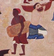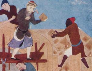 | The two big paintings given serve only as illustration on Amir Khusrau's comments of using African people in construction work in India. The paintings are details from the: "The construction of fort Khavarnaq" by Kamal ud-Din Behzad Herawi, Herat c. 1494-1495, Timurid era. The two small paintings are from a copy of this work in the 17th century. | ||||||||||||||||||||||||||