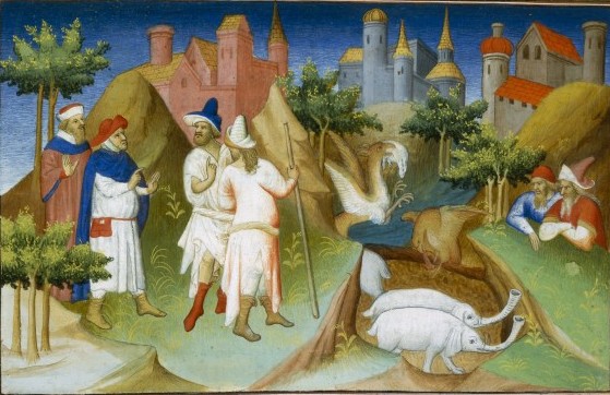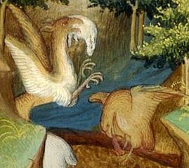 Fol. 88r: The island of Madagascar. Four travelers ascending a hill. The illustrations depict three cities in the background and the marvelous fauna of the island: elephants and an eagle; a griffin (Rouck) taking off, holding a sheep in its beak. The picture represents the envoys of the great Khan to Mogadishu. |