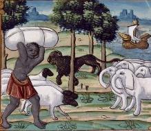 | From mss 5219 from the French National Library there are two pictures from Marco polo; one of the Ruc taking an elephant and one of Zanguebar with the sheep who all have black heads. | ||||||||||||||||||||