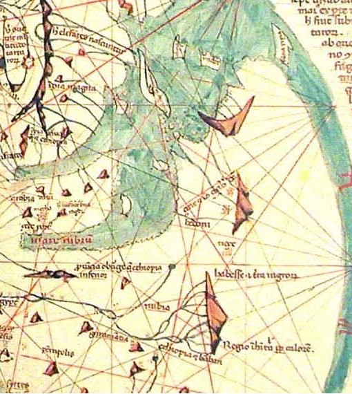 The world-map found in this book is clearly based on Arabic sources ; it depicts Africa in a wide truncated fashion typical of Arabic influenced maps, with a passage into the Indian Ocean of roughly 1500 km wide. There are more then 30 copies extant of this manuscript. The inscriptions for East-Africa on this map differ from one copy to the other; I will give a short overview: ON the East African coast can be found ginger (zinziber) and nutmeg (no�a) : He connects Ginger (Zingiber) with Zinj. This is a wrong connection as the Ginger tree is from India. It never grew in East Africa. Some 16th century Portuguese however, said it grew in Madagascar and the Comoros (?).On another copy is mentioned : axiba (ariba on this copy) for Zanzibar. The Paris copy of the map has as inscriptions for Africa that do not occur on most other copies: Locaccessim; regio inhabitabilis propter calorem (This region is uninhabited because of extreme heat.) ; Habesse terra nigrorum; Nesc; Chus; Haden; Bedoni; Zinc et imo Zinziber dictur. And these last names stand in front of two towns drawn on the foot of a mountain. Never of his maps is Zanzibar an island, in fact in all cases the two towns and the inscriptions are inland. Several of the copies of his maps have to the north of Zanzibar on the mainland an area- name called : Bedona. Easily recognizable as Idris too has a town called Bedouna north of Zanzibar. Further north again there is a city on the coast called Haderi (not on the copy shown here) and inland indications of some other cities and Nubia placed north of the Mountains of the Moon and Habashi south. The Red Sea is called Mare Rubrum ; a name not taken from Arab sources but from classical works. Some copies of his map show a big island at the mouth of the Persian Gulf called Kis (not on this copy) this is the island-town that took over the trade from Siraf in Persia. The crown-like island south of Zanzibar is called Nebio, a name also on Fra Mauro's map (as Nabilah) and is the Arabic word for Beautiful. One island has a forest of pepper trees, an other is inhabited by pirates, and a third is called island of Linga, dicitur Kamar. Among the islands in the Indian Ocean is one called Esfacie according to some authors this is close enough to Anfoudja of the Comoros. If one compares his map of East Africa with the one I constructed from the coordinates given by Abulfeda one can not avoid thinking that they must have used similar sources. On Abulfeda's map we have the Al-Kerany mountain, this mountain is also present on one version of Marino Sanido's map. The Nile on Marino Sanudo's map is constructed in the old Ptolemian way, the branch coming from the mountains, closest to the sea is called Nile, the one furthest inland is on one copy of the map mistakenly called (on some copies) flumen Jordan (river Jordan). |