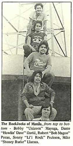 I owe everything I have learned in radio to all my fellow rockjocks atDZRJ-AM & DZRJ-FM 100.3, but most of all, to these legends of Philippine radio:Mike "Stoney Burke" Llamas, for letting me tag along with him toDZUW radio to watch him on-air, on those many mornings that I skipped school, and for being a big brother all the years.� To Wayne"Walloping Wayne" EnaJe and Ron "Baby John" De Asis for letting me go on the air as a weekend jock at that legendary "underground" one kilowatt Rock radio station DZUW-AM 1310.� ToAlan "Double A" Austria, for the Black beauties, but, seriously, for� giving me that dagger stare whenever I screwed up (if looks could kill I'd be dead by now), and for being the inspiration in honing my craft like when he took me out of UW's laid-back type of rock announcing and make me learn the ropes at TOP40 with the first rock and roll radio station in the Philippines,DZRJ BOSSRADIO. His influence in production work, led to my perfecting the "Frankenstein" (splicing) way of doing promos in the old days with a two-track TEAC.� To (the late great ) Arthur "Little Rock" Peckson, or "DAGA" for short, for always being there when I had the blues, and his wisdom, man, small guy but he has the biggest heart.� To Jimmy Labrador, the first time I ever went up the tower, he was the first, and quite frankly, the best top40 DJ I have ever heard since, he made quite an impression on a 12 or 13 year old kid whose older BOSSRADIO fan of a brother dragged up to the RJ tower while they were visiting Grandma, who just happen to be living next door to the station in Sta. Mesa, Manila. To my Kumpare's & brother's in Rock,Alfred "The Madman" Gonzalez or better yet, "PUTIK", Bobby "The Unicorn" Mayuga, Manny "Libog" Casaclang (the MOLE), Howling "Brain Salad Surgery" Dave, and the rest of the pack, we really did ROCK the Philippines!!!