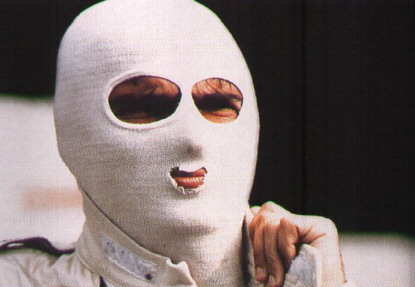 que escapavam da pista) arrancou o seu capacete, e ele sofreu queimaduras terríveis. Criaram então a balaclava, em tecido antifogo, para dar uma protecção extra, e o resultado positivo já