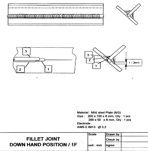 Welder yang mempunyai Sertifikat 1F hanya boleh melaksanakan pekerjaan sambungan sudut pelat baja lunak posisi di bawah tangan, sedangkan Welder yang mempunyai Sertifikat 4F boleh melaksanakan pekerjaan sambungan sudut pelat baja lunak semua posisi