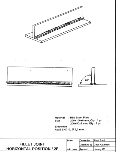 Sambungan sudut pelat baja lunak posisi 1F Sambungan sudut pelat baja lunak posisi 2F Sambungan sudut pelat baja lunak posisi 3F Sambungan sudut pelat baja lunak posisi 4F Sambungan tumpul pelat baja lunak posisi 1G Sambungan tumpul pelat baja lunak posisi 2G Sambungan tumpul pelat baja lunak posisi 3G Sambungan tumpul pelat baja lunak posisi 4G |