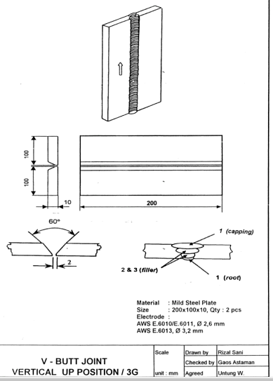 Pakaian kerja, jaket kulit atau apron, sarung tangan, sepatu las, helm/kedok las DC/AC Mild steel ASTM A-36 200x100x10 mm, 2 buah kampuh 300 s.d 350 AWS E 6010/6011, penetrasi AWS E 6013, jalur 2 dst Æ 3,2 mm90 Ampere s.d 120 Ampere . 100 Ampere s.d 130 Ampere. Jalur 1: 4 s.d 5 inch/menit. Jalur 2 dst : 2 s.d 3 inch/menit 1G/2G/3G/4G*) |