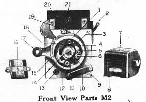 2. Primary lead assembly 3. Cam 4. Contact screw bracket assembly 5. Contact screw bracket fastening screw and washer 6. Primary lead fastening screw 7. High tension winding 8. Safety gap holder 9. Front plate 10. Cam screw 11. Breaker bar spring with nut and screw 12. Condenser stud (long) 13. Front plate fastening screw and washer 14. Cam screw washer 15. Breaker bar with platinum point 16. Condenser 17. Advance lever 18. Breaker bar bearing screw 19. Contact screw with platinum point 20. Contact screw lock nut 21. Secondary distributor carbon brush |