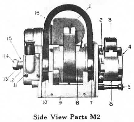 2. Advance lever fastening screw and washer 3. Breaker box cover 4. Condenser cover 5. Spring assembly for condenser cover 6. Breaker assembly 7. Bearing holder (Breaker end) 8. Pole structure 9. Base 10. Bearing holder (drive end) 11. Brush holder support fastening screw and washer 12. Drive shaft 13. Shaft nut washer 14. Shaft nut 15. Drive key 16. Magnet |