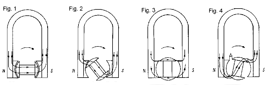 Fig. 3 shows the "neutral" position of the armature wherein it is subject to flux-flowing across its ends as shown. This position does not permit an abrupt change of the flux flow as hereinafter described, and such as occurs in the DIXIE. The armature is never completely out of the flux, but simply turns around in the flux stream, twisting the lines about, but not actually abruptly breaking them.