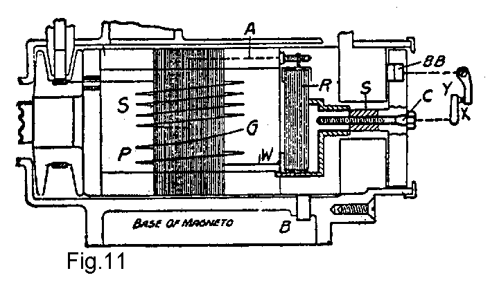 Now it is obvious that the mass of iron in the armature must reverse its magnetic polarity. In Fig. 1 it is saturated with magnetism flowing in one direction. In Fig. 4, the direction is reversed. This reversal must take place in each rotation, so at high speeds the quicker the iron reverses the better the spark. As a laminated armature, or one built up of a number of pieces of iron, reverses quicker than a solid one, all good armatures are laminated. But it is also evident that to secure the desired amount of current the armature must be of a certain size to contain the necessary wire, and therefore contains a certain amount of iron in some form. Now, the more iron beyond a certain limit, the slower the reversal and therefore an important further parameter for judging any magneto's performance is its coil-to-iron size. This parameter puts certain limits on the armature magneto because the coil and size of the rotating iron are immediately linked to each other whereas in the DIXIE the engineer has more freedom for selecting the coil and iron size.