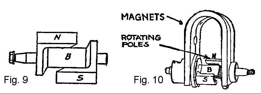 The magnet has two rotating polar extremities (N) (S). These poles are almost in contact with the inner cheeks of the permanent magnet (M), all air gaps being virtually eliminated. The magnet is positioned at right angles to the rotating poles or ends of a field structure consisting of laminated pole-pieces (F) and (G) (Fig. 6), carrying across their tops the laminated core carrying the windings (W). When (N) is opposite (G) the flux flows from one pole (N) of the magnet to (G) and through the core (C) to (F), this action corresponding to what happens in the armature type with the armature in the position shown in Fig. 1.