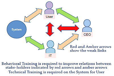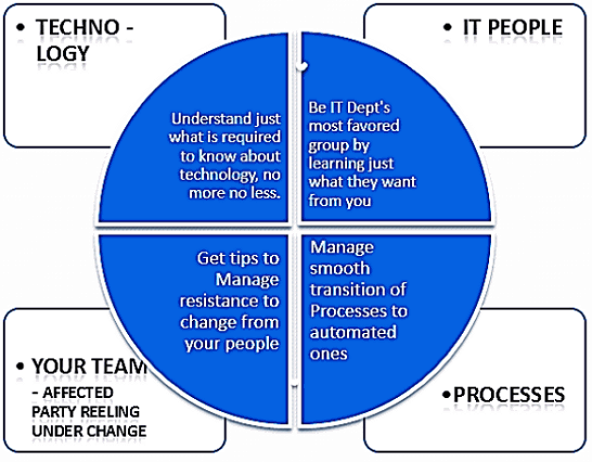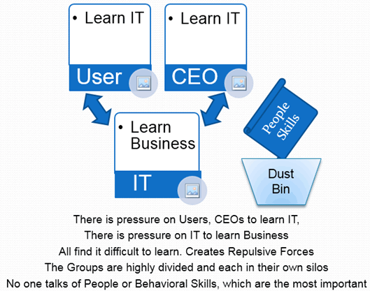 The skills required for IT success in businesses are more managerial than technical. In a nutshell, when people are involved in a collaborative, interdependent process, there is bound to be disruption, resistance, blame game, conflict and stress. PICTURE IS NOT SO ROSY AS IT APPEARSThough things may look very rosy from outside, ground reality in businesses is actually quite opposite. There is a huge turmoil during IT-transitions, stress and friction between stake holders resulting in blame game and politics. There is a big divide between IT and the user departments and most often the top management remains a helpless witness, not knowing how to handle these disputes. Top Business Professionals are confused and stressed as they are unable to cope with IT-Driven Change. They don't know what to learn to equip themselves and end up trying to learn complex technology or programming, or technical details, which, as this paper shows, they need not learn. No wonder, they find IT too complex. Senior managers feel insecure worrying that the younger generation is more IT-Savvy. They feel that the younger generation will make them obsolete. On the other hand the GenY has a misconception that it is very IT-Savvy just because they are much better at using gadgets and software tools. They are unaware that what businesses need is not IT literacy but IT awareness. Today Businesses are struggling to cope with rapid changes in business environment and ground rules. Enough research has been done on helping businesses to manage change. Change management courses and seminars have been in existence for decades. But there is something seriously lacking in the way change management is being addressed. In today's world, technology, particularly Information technology (IT) is the biggest and most aggressive driver of change. While Information technology is changing by the day, Change management techniques have remained traditional and more or less the same over years. In particular, they have not evolved to include content which educates you on how to manage the most significant change, i.e., IT-Driven change. And managing IT-driven change needs specific skills very different from managing normal change. This has resulted in major failures in IT projects and huge losses for businesses. The IT projects, particularly ERP projects fail because not enough emphasis is laid on behavioral aspects of managing the resultant change due to deploying or implementing the IT projects. Even if emphasis is laid, the change is managed without specific skills for managing IT-Driven change. IT failures result in huge losses in cost and time, leave alone the indirect cost due to fall in efficiency during implementations and the stress and politics caused by friction during change. IT Experts have estimated a failure rate of almost 70-80% in ERP projects. The immense loss due to this failure cannot be imagined. It is strange that not much progress has been made in research to reduce this huge loss to industry and pain area/stress-generator for corporate employees. When I refer to IT transitions, I would be mostly talking of ERP software implementations. The figures of 70-80% IT failures too refer to ERP failures. We look at the IT woes of the corporate world, but first from the point of view of individual managers and then from the point of view of businesses and groups of managers - because individuals and people are the most important actors in any change. We look at what goes on in the minds of individuals first and then look at the mess in the business processes of IT transitions/IT implementations. CHAPTER 3: IT WOES OF EMPLOYEES/MANAGERSWrite to Me | Comments | Related Articles | Top To know the IT Woes of corporate managers, it is important to study what goes on in the minds of the managers during ERP implementation, and how it finally impacts the outcome of the IT project PERSONAL ISSUES OF TOP MANGERS1. Most top managers harbour an innate fear of IT and a complex that the younger managers are more IT aware than they are. The worst is when the CEOs have this complex - then they avoid getting involved and tend to push all IT work to COO, CFO, etc. Most managers even fear that they will make a fool of themselves in front of their juniors because of their ignorance. In effect, they don't get involved in driving the change process and that becomes the primary cause of failure. 2. Managers are very eager to learn because of their subconscious complex ("I don't know IT"), but they simply do not know where to start, and what to learn. They end up trying to learn the wrong stuff and find it too tough and give up saying "IT is not for me". 3. Most Managers would like to make the best use of IT, streamline their processes and information systems for better control, and to reduce their stress at work. But they fell flat in their last attempt to automate processes with the help of the IT department folks. Their experience with both IT and the IT folks was nowhere near satisfactory, on the contrary it was frustrating. They always thought that the IT folks could not give them what they wanted though the IT department had a magic wand in their hand. 4. What they got was far below expectations, and most importantly, the tedium of the transition was completely unexpected. They had thought that IT would be a panacea to all their problems and they never expected that they would have to work so hard to get so little. All this obviously led to frustrations, anger, blame game and a total rejection of the capabilities of the IT folks. The user departments always thought that the IT folks did not know business at all, and the IT folks complained that the user department did not know IT. Net result was that there was a big rift between the IT department and user department. You, as a manager, are clearly not in control. CHANGE IS DISRUPTIVEChange is always disruptive, but IT-Driven change is more confusing and stressful because it appears mysterious. 