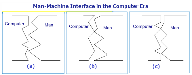 Note that the representation of the computer (particularly the interface facing the human) is changing rapidly from one diagram to the other. Man has tried hard to change his behaviour & lifestyle to develop a compatible or matching interface with computers, but changes in computers are too rapid to keep pace., and hence the interface still remain unmatched in Fig. 3c