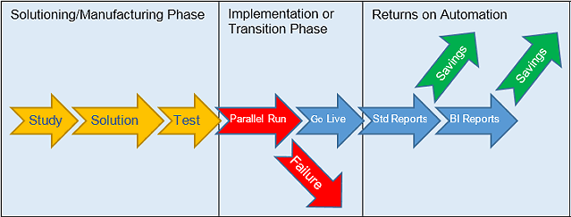 (Images courtesy: YouTube Channel GTO Fast & firstwetakemanhattan.org) Where is the Disruption?Write to Me | Comments | Related Articles | Top While you enjoy the convenience of on-line services delivered by IT, I would like to turn your attention to a little known and publicised aspect of IT – the effort and processes involved in actually bringing or delivering these services to you. Some people have made efforts behind the scene to build the solution, to implement the solution and ensure smooth delivery of services suitable to your satisfaction. When you enter your new house or office premises or a new factory you have been freshly appointed to work in, you see the final end-result of your building or factory. You are not aware of what effort and meticulous planning went into building that product. I realized the amount of effort that goes into this when I had the responsibility of IT Head in a projects firm which was building a Steel Plant. I was shocked to know how much attention needs to be paid to every detail, the forces operating on every single truss, every single beam and pillar that holds the building, to ensure that it bears the pressure of things it is holding not only in normal times but also in disaster situations like earthquakes, etc. Similarly, when you use, for instance, the online banking application you are not aware of how much effort and pain (yes pain) has gone in bringing this automated service to you. Possibly, the bank would have failed in the first few attempts before succeeding to bring you the automated service. There are umpteen stories of ERP failures if you just search the web on “ERP Failures” [Ref.5, 6]. Not only is the effort of developing or configuring software for your business processes a very intricate process taking months and sometimes years, but the process of transition from the old system to the new automated process (called System implementation) is also extremely painful. It is very stressful, not only because you are shifting to an entirely unknown process from a process which you had mastered for years, but also because there is a duplication of work because of a process called parallel run. During parallel runs, there is duplication of work because you have to work in both the old and the new system to compare results and establish the accuracy of the new system. As we will see later, Implementation is the most vulnerable phase in the entire life cycle of a project. The Vulnerability inside Businesses – Over 70% FailuresWrite to Me | Comments | Related Articles | Top Not many are aware of the turmoil and hardships that company employees go through during this process of implementation. Leave alone the academicians, even software professionals who work in consultancy organizations or software manufacturing firms are not aware of this, since they have rarely implemented systems. Manufacturing and implementing software are two very diverse activities. The people who are most familiar with this aspect and may have faced the heat of this phase are the CIOs, IT Heads and other members of in-house IT departments who are on the ground during the implementation phase. In most of my discussions on of issues in IT, I have noticed that people mostly discuss issues in software manufacturing companies, not many even understand the problems of IT user companies implementing IT/ERP solutions. And lesser still is the awareness that there are over 70% failures in ERP implementations. Yes, researchers say that over 70% of such ERP implementation projects fail despite this humungous effort and a huge amount of time and money spent on the project. [Ref.5,Ref.6] What the World is MissingJust imagine, 70% failures would mean that you get the benefit of only 30% successful automation projects! The comforts that you experience from the online services and are immensely satisfied with are due to just 30% of the projects which could be successfully implemented and could see the light of day. Other 70% of the projects which would have brought so much more comforts to you never saw the light of day. Just think of it, your life would have been 70% better had the ERPs not failed. Not to talk of the huge money lost, because after all, it is finally your and my money that goes down the drain due to failures. So the need of the hour in this new world of disruption is to focus on the most vulnerable part of the technology disruption, that is, the IT implementations. Such implementations are carried out either entirely by the internal IT departments of companies (the type of that I have been heading as a CIO) or by the IT departments with the help of external companies who have experts to handle ERP implementations. So the real focus of academicians and researchers should be on understanding this most vulnerable part of the IT process and ensuring that the failures are reduced. But unfortunately, neither the academic fraternity nor the IT folks have taken this issue very seriously and worked to reduce the chances of failure. Shifting Focus from Software Manufacturing to ImplementationWrite to Me | Comments | Related Articles | Top Fig. 2 shows the different phases in the ERP project cycle.
