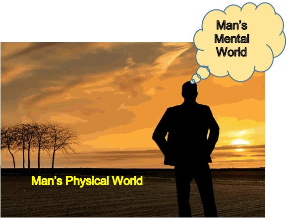 We may not realise it, but we live in two worlds, not one: the physical world and a mental world. In the physical world, we have made quantum leaps into space age featuring starships and AI. In the mental world, we are still in stone age with mysteries like happiness, morality, and spirituality as yet unexplained (Fig. 1). Fig. 2 is a pictorial representation of this idea. Fig. 2.1 is our familiar scientific representation of the physical world. Fig. 2.2 tries to describe the mental world analogous to the physical world.