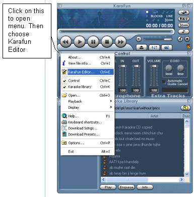 You can open the editor from the Karafun player as shown in the screen shot below. The installation also creates a separate shortcut on the desktop for editor, which you can click to open the editor. The command for running Editor from Command prompt is "C:\Program Files\KaraFun\KaraFun.exe" /editor