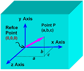 Feel free to skip this section if you recall your lessons from school physics. In the physical realm, we perceive a three-dimensional space (refer to Fig. 2.1), where each object occupies a distinct position. We use the coordinates x, y, and z to measure distances in the three dimensions or directions from the Point of Origin (Reference Point represented by coordinates (0,0,0) in Fig. 2.1). The physical position of an object in this space is indicated by its x, y, and z co-ordinates. For instance, in Fig. 2.1, if an object is located at point P, its position is specified by co-ordinates a, b and c respectively. Therefore, Fig. 2.1 represents the familiar physical space.