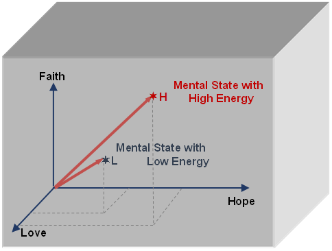 Upon close analysis, it becomes evident that that there indeed was a change that transpired within you - in your state of mind. The transformative words shifted you from a state of hopelessness to one marked by hope and determination. The catalyst for this shift in the "mental state" was your feelings. The feelings of fear and despair gave way to hope, confidence, and courage. You had more faith in yourself. In essence, if feelings were measurable, you registered low on certain feelings at position L and high on those at H. Hence, the axes of the mental space are identified as your feelings. In Fig. 4, we illustrate a schematic representation of Mental Space with three pivotal feelings as axes: Love, Faith, and Hope. Point L denotes your position in the mental space before hearing the encouraging words, while Point H signifies your position afterward. Point L corresponds to a low mental and energy state, whereas Point H signifies high levels on both fronts.