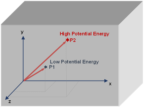 It is widely acknowledged that every object in the Physical Space possesses potential energy. The amount of potential energy depends on the object's position within the three-dimensional space, as indicated by the x, y, and z axes. In Fig. 2.2, an object situated at point P2 has a higher potential energy than an object at point P1.