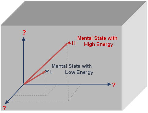 Point L signifies your position in the mental space before the uplifting words, representing a low mental and energy state. Point H symbolizes your position afterward, characterized by elevated mental state and energy. Note that the axes of the mental space are yet undetermined and are marked with red question mark ('?'). If P1 and P2 denoted positions of low and high potential energy in our familiar physical space (Fig. 2.2), points L and H represent the poistions of low and high mental energy in the mental space P1 and P2 denoted positions of low and high potential energy. Just as we occupy different positions in the physical space, apparently, we simultaneously occupy positions in the mental space too with varying energy levels. While the axes in physical space represented distances in x, y, and z directions, the three axes here are denoted with a red '?' to signify our current lack of knowledge regarding the axes of the mental space. Let's attempt to define these axes. 3.2 What are axes of Mental Space?