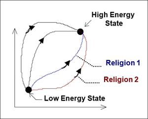 Fig. 8.2: In the Mental Space, we are in the dark about how to move from a low energy position A to high energy position B