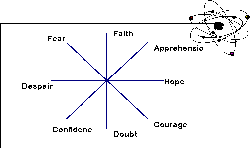 Table 1: Positive and Negative set of feelings Since there are numerous feelings, the mental space becomes a multi-dimensional space, which may look something as depicted in Fig. 5. Each line represents a feeling, with one side from the centre indicating positive measures and the other negative measures. For example, hope on one side and despair on the opposite side are depicted on a single axis as the positive and negative measures respectively of one set of feelings. However, for simplicity, we work with the three-dimensional mental space shown in Fig. 6.2, enabling a comparison with the familiar physical space (Fig 6.1).