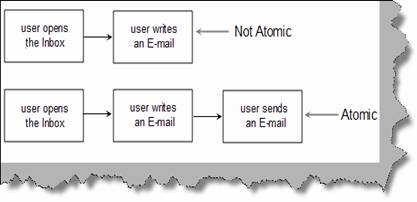 Use case transactions are atomic set of activities which are either performed or not performed at all. For instance below figure ‘Atomic’ shows the meaning of atomic in context of use case transaction. The first transaction cycle does not show a complete atomic activity; rather the transaction is in between and is not in persistent state. If you see the second transaction cycle it’s atomic because after the user sends the email it’s in persistent state and is sitting on the mail server.
