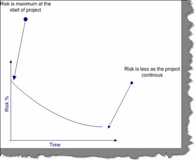 Risk is high at the start of projects, but by proper POC (Proof of concept), risk is brought in control. Good project managers always have proper risk mitigation plan at the start of project. As the project continues one by one, risks gets eliminated thus bringing down the risk.