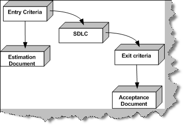 Above is a more global view of the how the start and end of SDLC. Any project should have entry criteria and exit criteria. For instance a proper estimation document can be an entry criteria condition. That means if you do not have a proper estimation document in place the project will not start. It can be more practical, if half payment is not received the project will not start. So there can be list of points which needs to be completed before a project starts. Finally there should be end of the project also which defines saying that this is when the project will end. For instance if all the test scenarios given by the end customer is completed that means the project is finished. In the above figure we have the entry criteria as an estimation document and exit criteria as a signed document by the end client saying the software is delivered.