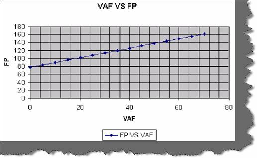between FP, AFP, GSC and VAF. In this experiment we will assume UAFP = 120 and then lot graph with GSC increment of five. So the formulae is VAF = 0.65 + (GS/100).