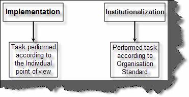 Implementation: - It is just performing task within a process area (for definition of process area look in to the same chapter). Task is performed according to a process but actions performed to complete the process are not ingrained in the organization. That means the process involved is according to individual point of view. When an organization starts to implement any process it first starts at this phase i.e. Implementation and then when this process sounds good it is raised to the organization level so that it can be implemented across organizations.