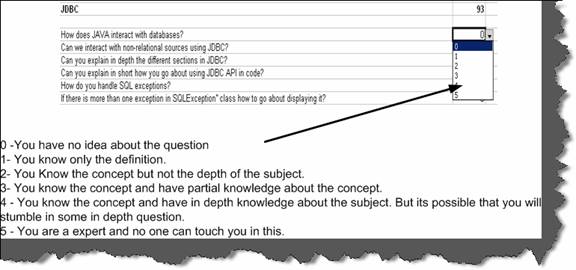 In the CD, we have provided an Interview Rating MS-Excel sheet. This sheet will help you in gaining an insight into how much you are ready for Software testing, JAVA, .NET , SQL Server , Networking or project management interviews. In the excel sheet, we have thirteen sections: