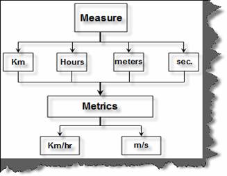 Measures are quantitative unit defined elements for instance Hours, Km etc. Metrics comprises of more than one measure for instance, we can have metrics like Km/Hr, M/S etc.