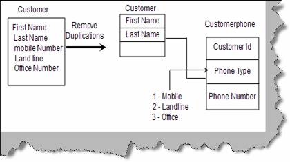 When a project has constrained time lines it’s very much possible that project can have lot of duplications. So when developers have executed the task they can review for these kinds of duplications. For example the below figure ‘Remove duplication’ shows how the phone number duplication is removed from the customer table. The customer table had repetitive fields like mobile number, land line and office number. In abstract terms these represent telephone numbers. So we split the customer table in to two tables one is the customer table and the other is customerphone and built a relationship between them.
