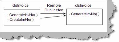 Below is again one more scenario where we have an invoice class which has two methods (“GenerateInvNo” and “CreateInvNo”) and they do the same thing, generate unique invoice numbers. We can refactor / improve the code by combining these two methods in to one.