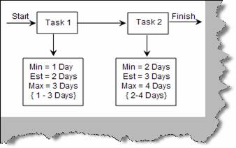 In Monte-Carlo simulation random value is selected from the range and possibility / model is generated. This model is saved and then the second random value is selected and so on. For instance consider the below figure ‘Task1 and Task2’. ‘Task2’ can be finished only when ‘Task1’ is completed. We have also chosen the min and max range in which both the task can be completed. ‘Task1’ can be completed in a minimum time of 1 day and maximum of 3 days. ‘Task2’ can be completed in minimum 2 days and in maximum 4 days.