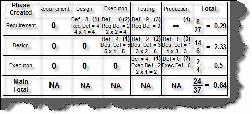Defect age is also called as Phase Age or Phage. One of the most important things to remember in testing is later we find a defect more it costs to fix. Defect age and Defects spoilage metrics works on the same fundamental i.e. how late you found the defect? So the first thing we need to define is what is the scale of the defect age according to phases. For instance the below table defines the scale according to the Phases. So for instance requirement defects if found in design phase has a scale of 1 and the same defect if propagated till the production phase goes up to a scale of 4.