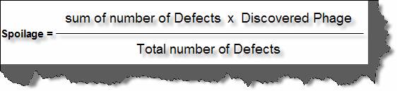 Once the scale is decided now we can find the defect spoilage. Defect spoilage is defects from the previous phase multiplied by the scale. For instance in the below figure we have found 8 defects in the design phase from which 4 defects are propagated from the requirement phase. So we multiply the 4 defects with the scale defined in the previous table, so we get the value of 4. In the same fashion we calculate for all the phases. Below given is the spoilage formula. It’s the ratio of sum of defects passed from the previous phase multiplied by the discovered phase then finally divided by the total number of defects. For instance the first row shows that total defects are 27 and sum of passed on defects multiplied by their factor is 8 ( 4 x 1 = 4 + 2 x 2 = 4). In this way we calculate for all phases and finally the total. The optimal value is 1. Lower value of spoilage indicates more effective defect discovery process.