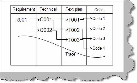 You can maintain the same in a simple excel sheet or you can have identifiers in every document and link them. For instance below figure shows an abstract view of how requirement r001 flows through the technical documents, test case and then to the final code.