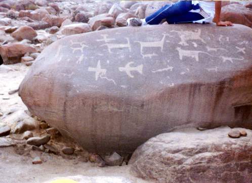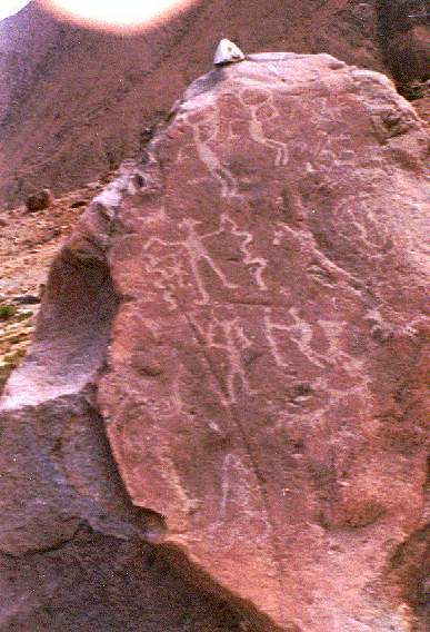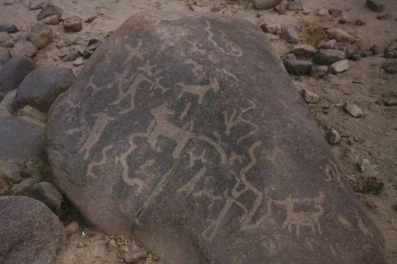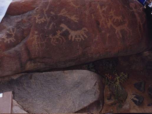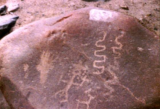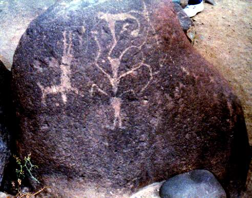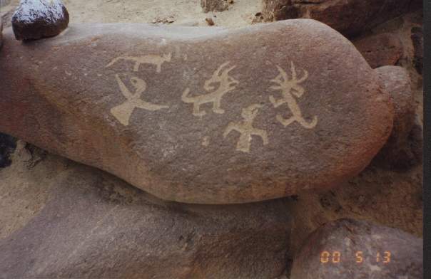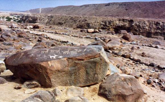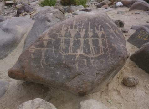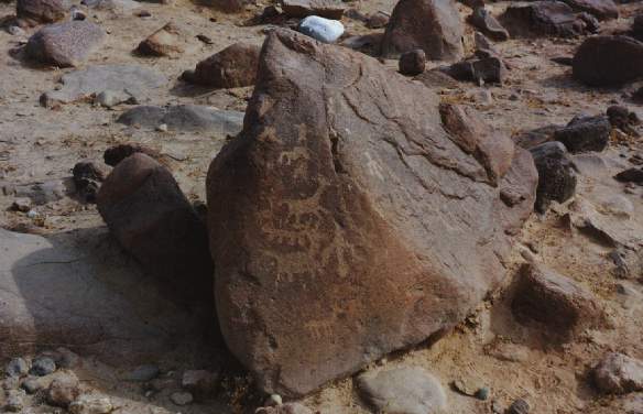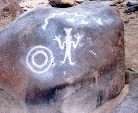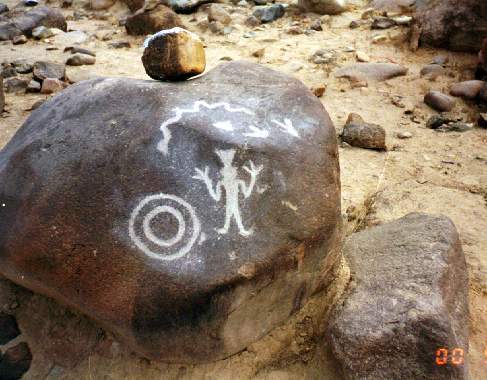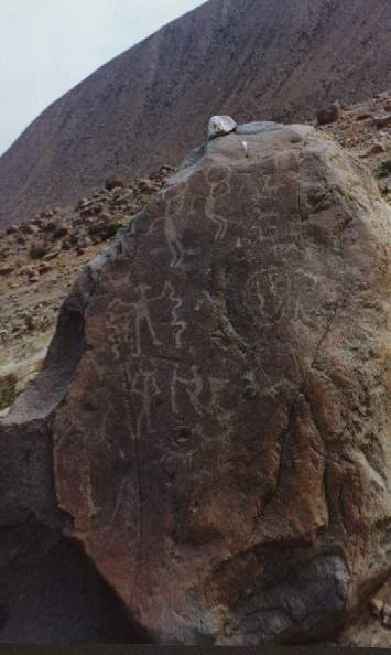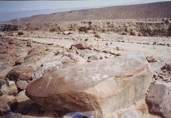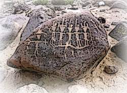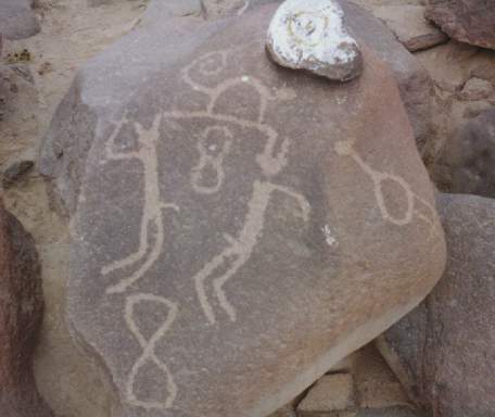 En un petroglifo se ha diseñado a dos hombres sobre sus respectivas balsas, uno frente al otro, portando una lloquena (especie de remo) en actitud de