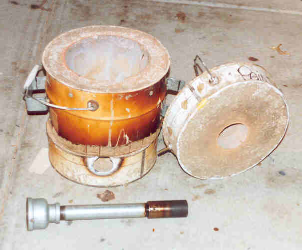 This is my version of Dave Gingerys melting furnace. It is made with castable refractory cement and a old 10 litre paint can. Im using a Ron Reil burner to fire it, running on LPG i have measured temperatures with a thermocouple of around 1000degC so its what i need to melt aluminum.