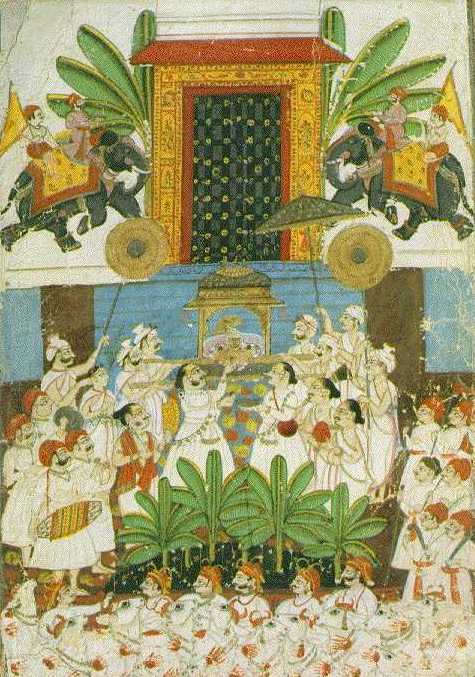Tribals from all over the state of Mewar come to loot the Annakut. This is a special privilege given to them since Krshna's time when the Lord himself desired to share the bounties of Annakut with all the people of Vraja. They carry away heavy pots of food and stuff their large scarfs with the rice. Many climb the ceiling high gratings to get a darshan of the Lord. Festivities over, Navnit-Lal and Vittalnathji return to the familiar comforts of home. Covered in a thick cloth of red and gold embroidery, Vittalnathji's palanquin returns with its retinue to His haveli across the Priyatem Pole - Beloved's Gate. Divine Lords are greeted at the entrance of their respective havelies by "Swasti-Vachans" from the Vedas.