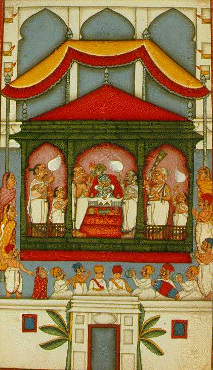 Today in Shrinathji's and Navnit-Lal's haveli, the whole scene is reminiscent of royal hunts when Imperial tents were set amid beautiful groves. Refinements of courtly life were enjoyed in a rustic/ rural setting. Richly decorated awnings stirred in clear mountain air as delicate glass chandeliers spilled pools of coloured light amid silk carpets, cushions and bolsters. At Nathadwara, such scenes are regularly brought back to life to entertain the Divine Lords.