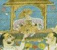 Navnit-Lal's clothes are of also of orangy red brocade but have green flowers on them, worked in finest silk. Pearl and diamond necklaces are occasionally punctuated with rubies and emeralds to add colour to the overall grandeur. Early in the evening, He comes out of his haveli to grace a pretty pavilion of bevel edged mirror panels and wooden arches. The eight arched pavilion is profusely decorated with gods, dancing nymphs and gopies bearing gifts. Richly decorated Kashmirey vases, water ewers, paan boxes, Moughal surahies of red and green enamel, silk cushions and canopies are lit up by two, four tiered candelabras. Set on a high platform just outside his haveli, the glittering pavilion forms a beautiful silhouette against the night sky.