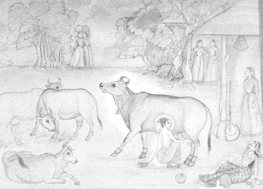 Krshna milking a cow for a gopi too tired to do it herself !