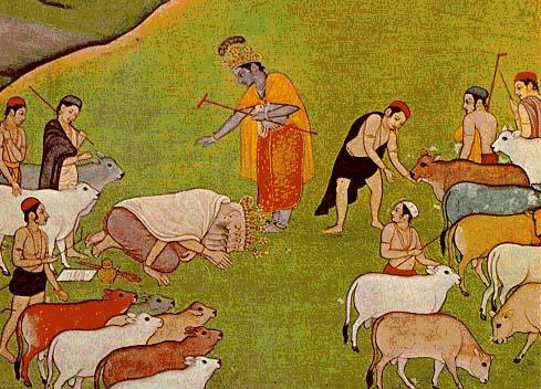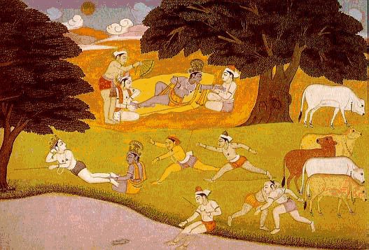one and the same as Krushna and Balarama as he rests with his young charges on the