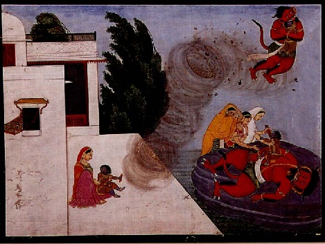 storm demon in a narrative style that shows Krishna seated on a terrace of Nanda